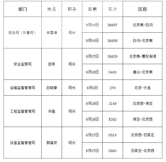 2019年8月份國家鐵路局機關部門主要負責人添乘情況