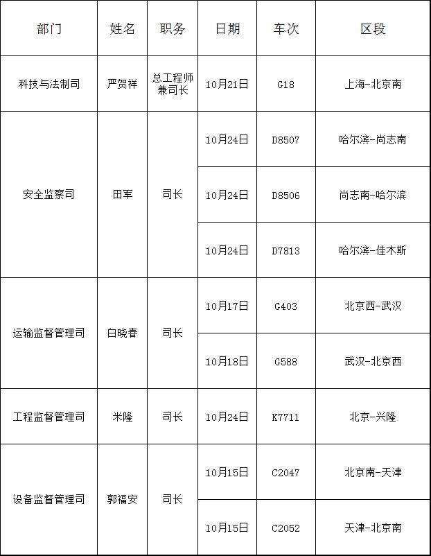 2019年10月份國家鐵路局機關(guān)部門主要負責(zé)人添乘情況