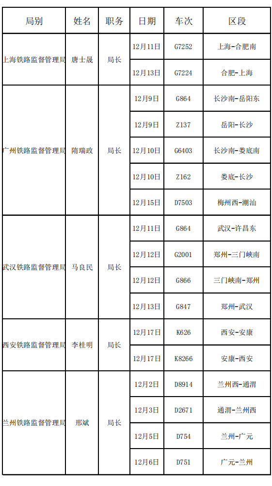 2019年12月份地區鐵路監督管理局主要負責人添乘情況