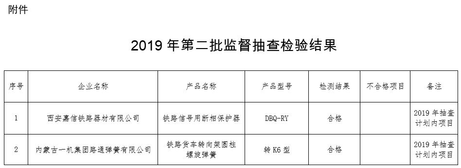 本批抽查2種產(chǎn)品2個廠項,檢測結(jié)果均為合格。按產(chǎn)品分類,本批抽查產(chǎn)品機(jī)車車輛類1個廠項、通信信號類1個廠項。具體情況見附件。